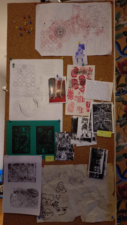 And I also finally got the corkboard on the wall, hooray! Awesome for putting up sketches n stuff related to whatever I'm working on at that given time.