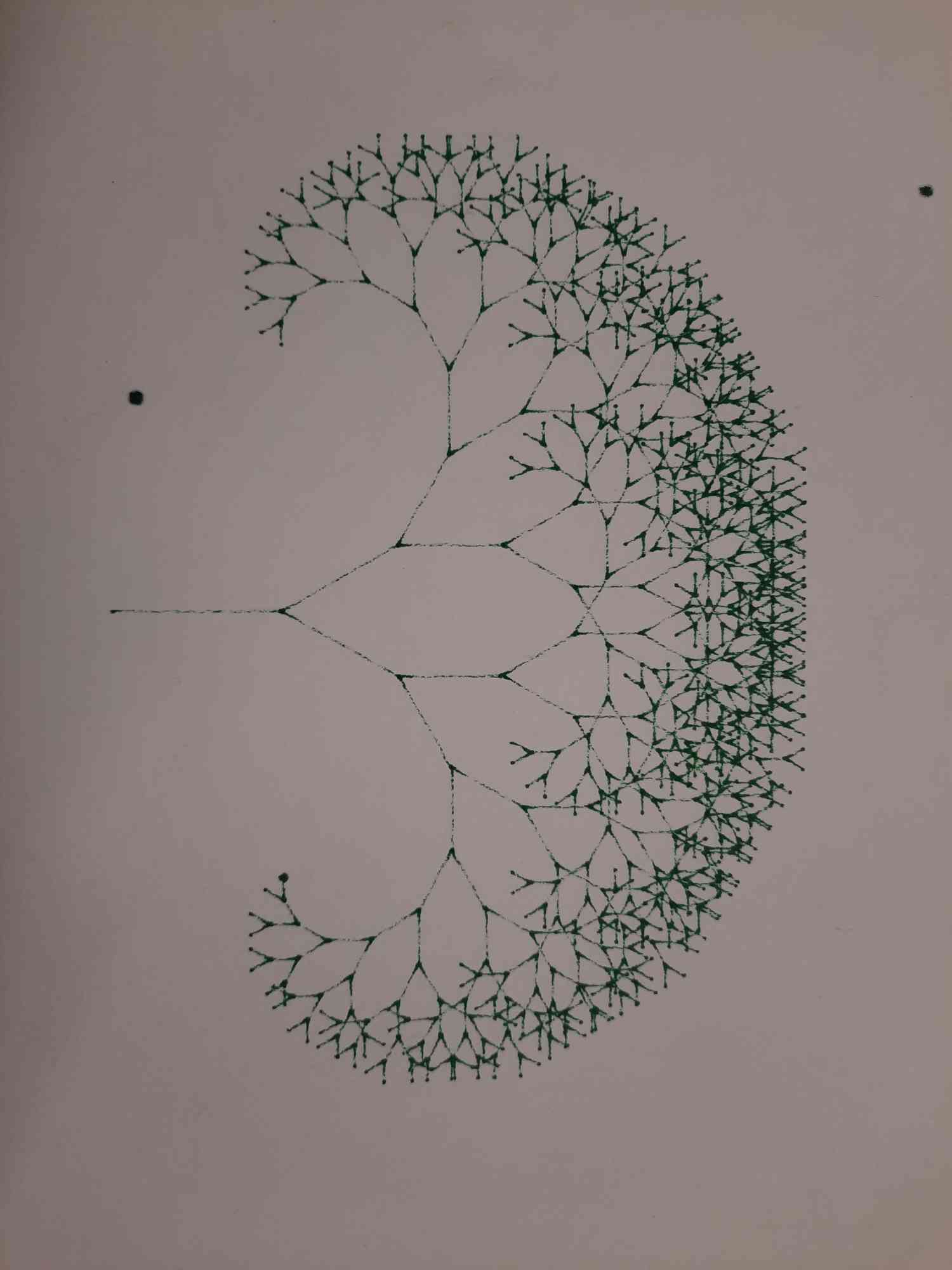 Side tangent: fractals! they are very cool, and using Python it's possible to generate a set of instructions for a pen plotter to draw them! You simply specify the start and end point of the first branch and go from there, creating in this case a binary tree fractal, much like the one you can see on the right here >>>>.