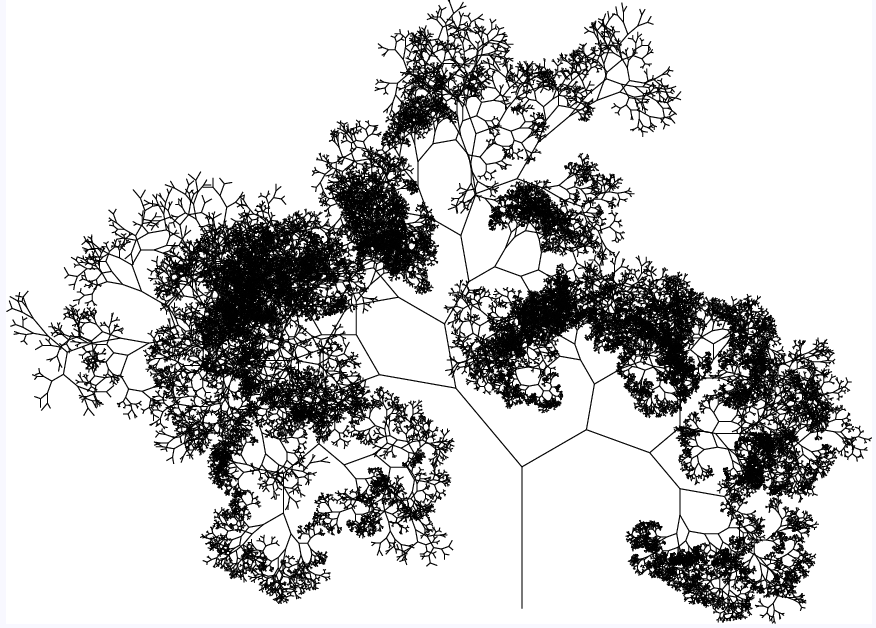 Well then you have a lot of variables you can mess with, for example what if you randomize the branch angle between two set thresholds, and do the same with the ratio? Turns out you end up with very organic-looking tree structures! Example below vvvvvv.
