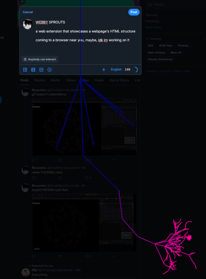 These explorations made me interested in generative art, not the evil swimming pool-evaporating kind, but the tuneable kind, which I can hopefully do more with in my coming project(s)! First up has been a browser extension called Webby Sprouts, which takes the open webpage's DOM and turns it into a tree fractal; visualizing the bones of a website.
